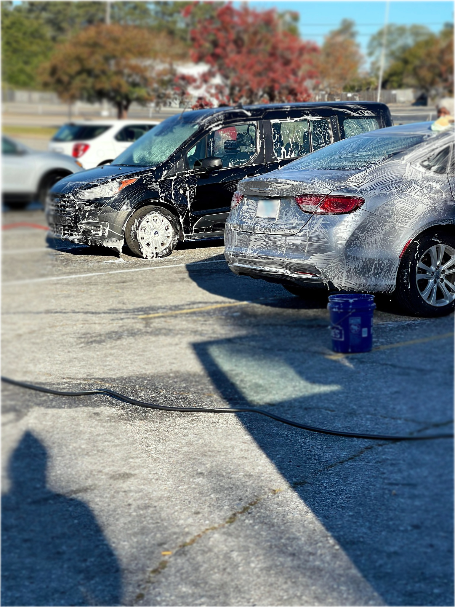 Hand soap and rinse car, blow outside creases and gaps, clean door jams, wash rims, dress tires, vacuum floors under seats, dress interior dash and door panels, clean windows